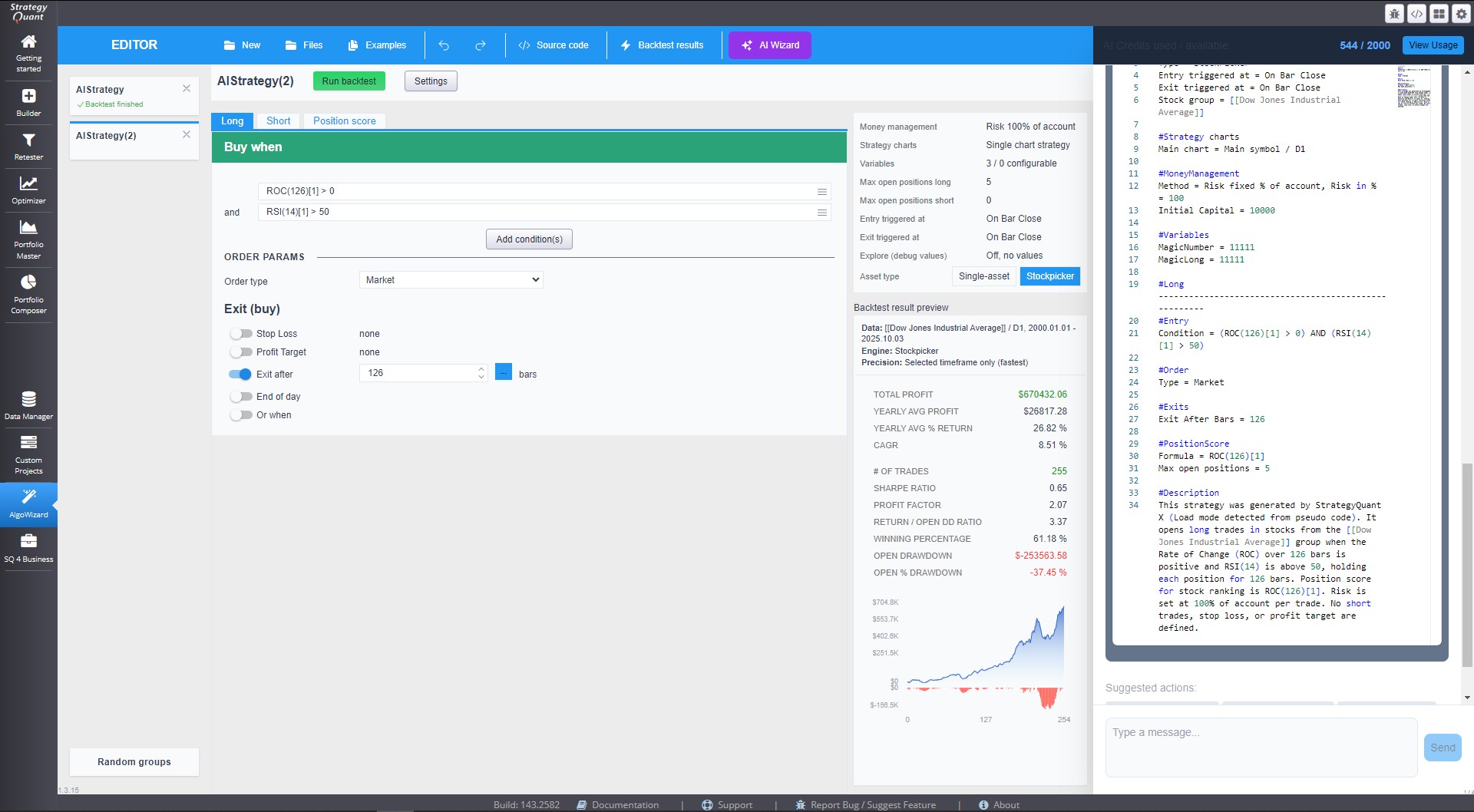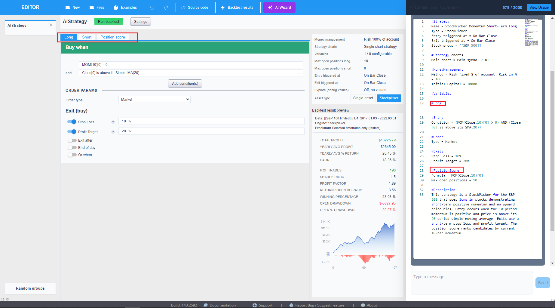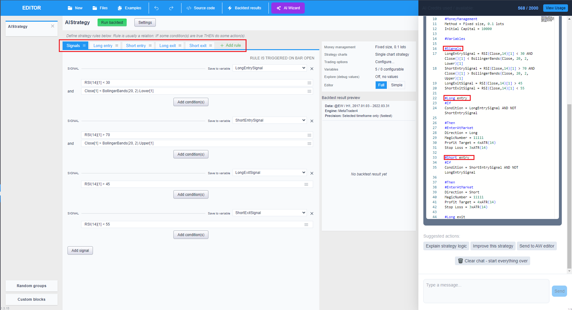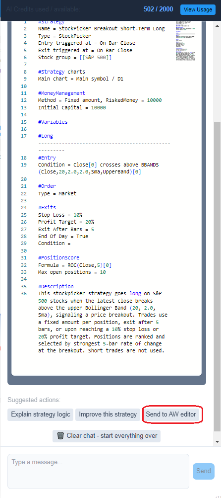 When a user defines a strategy or allows the AI to generate one based on a description, it can be sent to AW and backtested directly in SQX via “Send to AW editor” button.